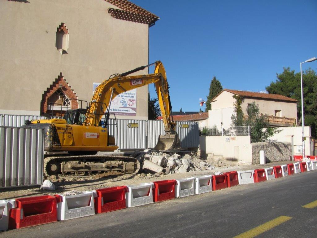 Elargissement de l’avenue du Docteur Pezet à Montpellier, en lien avec le chantier de la future ligne 5 de tramway, à la hauteur de la paroisse étudiante Sainte-Bernadette. Situation au 12 novembre 2019. Copyright : Edouard Paris