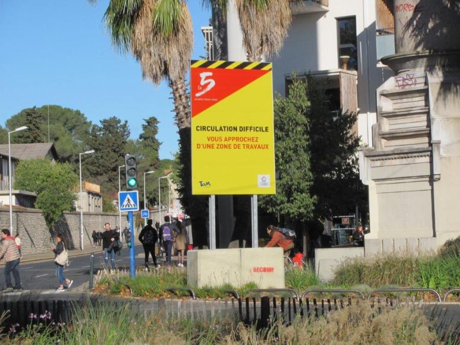 Panneau annonçant une zone de travaux, en lien avec la future ligne 5 de tramway, installé au pied de la colonne Saint-Eloi, place Emile-Martin à Montpellier, photographié le mardi 12 novembre 2019. Copyright : Edouard Paris