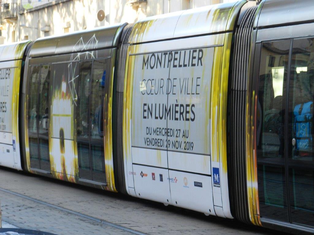 Aperçu de deux modules intermédiaires de la rame 2098 Citadis 402 Alstom multiligne aux couleurs de la 6e édition « Cœur de Ville en Lumières ». Photo prise le mercredi 13 novembre 2019. Copyright : Anje34