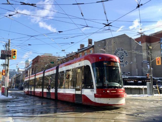 A Toronto, la rame 4475 Flexity Outlook Bombardier, opérant sur la ligne 504, est photographiée à l’intersection King Street East – Church Street, le mardi 12 novembre 2019. Copyright : Karine D