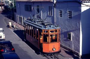 - A Palma de Mallorca, la motrice 4 Carde y Escoriaza-Siemens Schuckert-Brill (année 1929) est en tête d’un train circulant dans la rue Eusebi-Estada en direction de Sóller, le mardi 22 septembre 1981. Copyright : Michel Bozzola