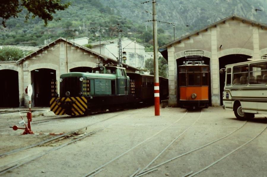 A Sóller, un train de voyageurs en provenance de Palma de Mallorca, exceptionnellement tracté par la locomotive diesel 01 Ferrotrade du constructeur alllemand Deutz (année 1968), passe à la hauteur du dépôt des tramways où stationne la motrice 1 Cardé y Escoriaza (année 1913), le mardi 22 septembre 1981. Copyright : Michel Bozzola