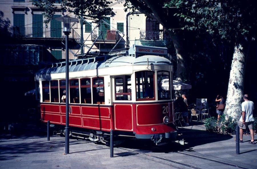 A Sóller, la motrice 20 Carris (ex-Lisbonne), en provenance de Port de Sóller, est photographiée sur la place de la Constitution, le dimanche 9 septembre 2001. Copyright : Edouard Paris