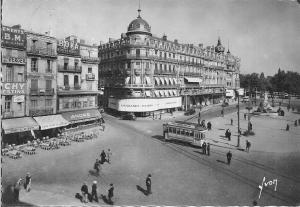 - Place de la Comédie vers 1940, à droite, deux motrices de la ligne C. Au 1er plan une remorque « baladeuse » circule en direction de « Champ de manœuvre ». Collection Michel Bozzola