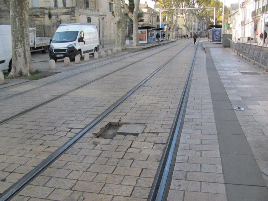 Etat de la plateforme du tramway commune aux lignes 1 et 4, côté voie 2, boulevard Louis-Blanc à Montpellier, au droit de l’agence de la Caisse d’Epargne, le lundi 18 novembre 2019. Copyright : Edouard Paris