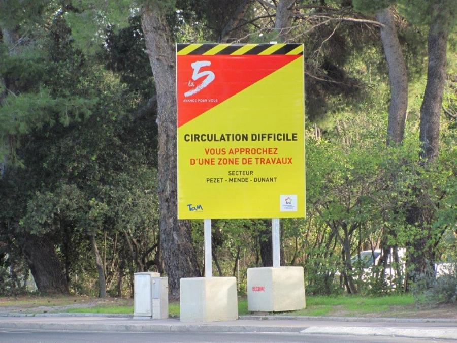 Panneau annonçant le chantier de la ligne 5 de tramway installé à l’angle de la Voie-Domitienne et de l’avenue du Père-Soulas à Montpellier. Photo prise le lundi 18 novembre 2019. Copyright : Edouard Paris