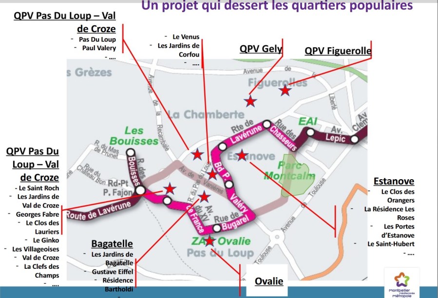 En rose la section de ligne 5 devant faire l’objet d’une enquête publique dans les mois à venir. Document Montpellier Méditerranée Métropole