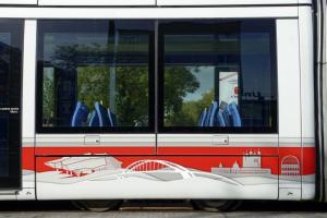 - Détails de la nouvelle livrée qui habillera progressivement l’ensemble du parc roulant du réseau de tramways lyonnais. Photo prise à la station « Beauvisage – CISL » du T6, le vendredi 22 novembre 2019. Copyright : Yvon Brument