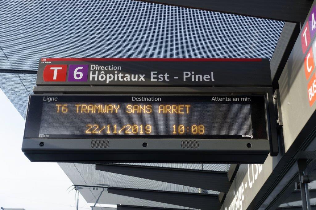A la station « Beauvisage – CISL », quai direction « Hôpitaux Est – Pinel », le tableau électronique d’information annonce le passage de la rame inaugurale de la ligne T6, le vendredi 22 novembre 2019 à 10h08. Copyright : Yvon Brument