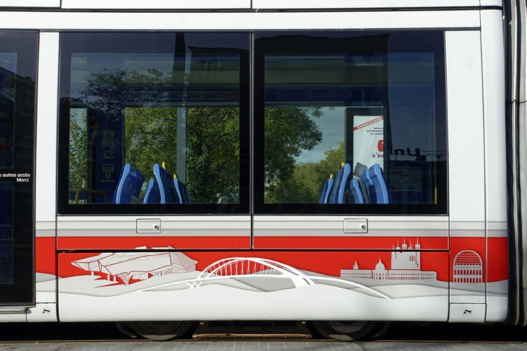 Détails de la nouvelle livrée qui habillera progressivement l’ensemble du parc roulant du réseau de tramways lyonnais. Photo prise à la station « Beauvisage – CISL » du T6, le vendredi 22 novembre 2019. Copyright : Yvon Brument