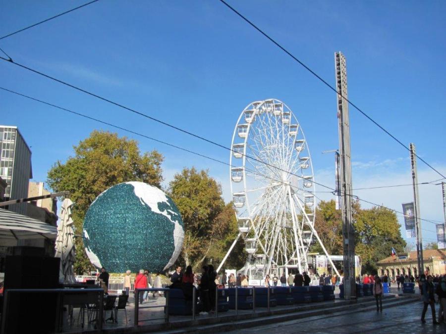 Mappemonde et grande roue, les deux principales attractions des fêtes de fin d’année, place de la Comédie à Montpellier. Photo prise le samedi 23 novembre 2019 à 14h03. Copyright : Edouard Paris
