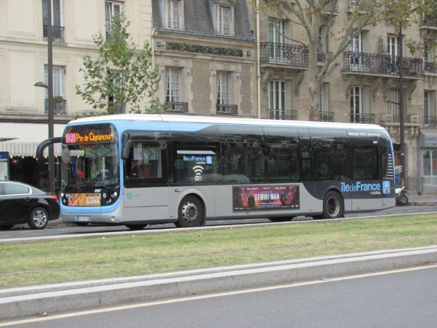 A Paris (18e), le bus 561 100 % électrique Bluebus SE Bolloré, opérant sur la ligne 341, est photographié à l’approche de son terminus « Porte de Clignancourt », le vendredi 27 septembre 2019. Copyright : Edouard Paris