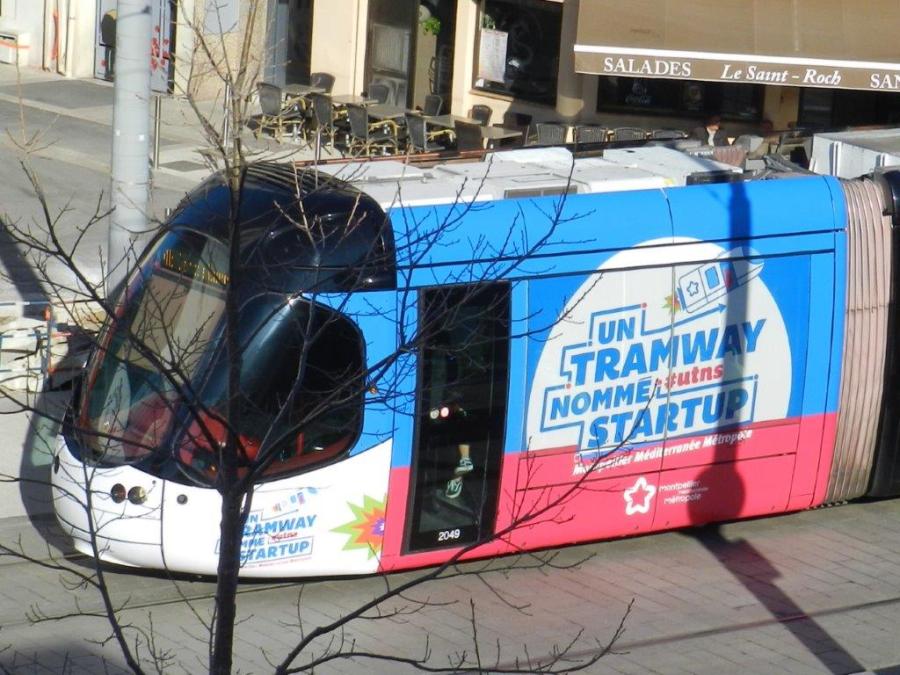 Gros plan sur une des deux motrices de la rame 2049 Citadis 302 Alstom multiligne au pelliculage intégral Un Tramway Nommé Startup (UTNS). Photo prise le lundi 5 novembre 2019 depuis la terrasse de la gare de Montpellier Saint-Roch. Copyright : Anje34