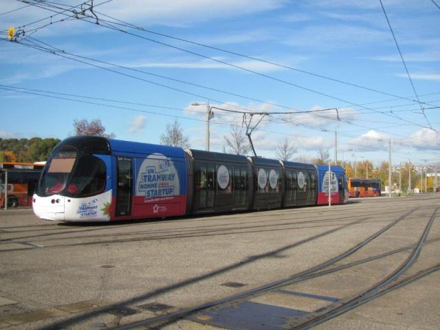 Les motrices de la rame 2049 Citadis 302 Alstom ne doivent en principe plus porter les couleurs d’ « Un Tramway Nommé Startup » depuis ce matin. L’ensemble de la rame a dû retrouver sa livrée noire.