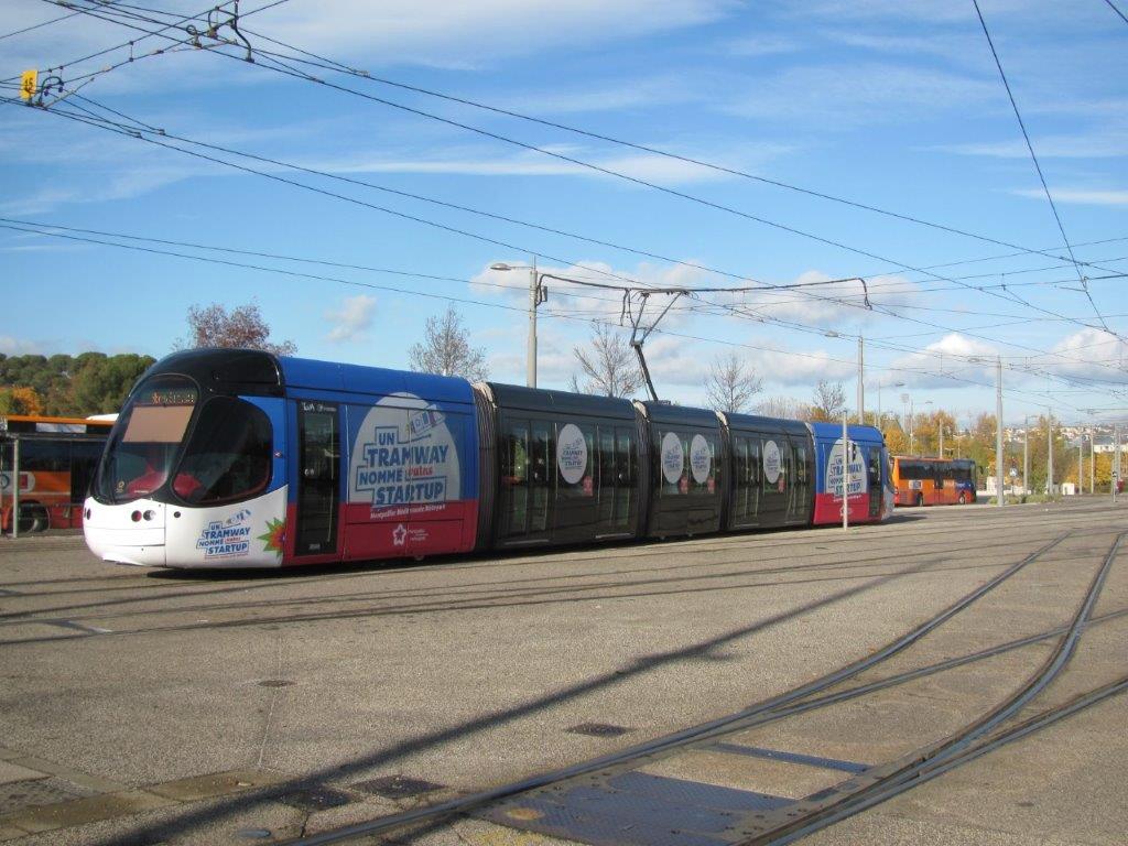 A 10h15, le mercredi 27 novembre 2019, la rame 2049 Citadis 302 Alstom multiligne « Un Tramway Nommé Startup » est aiguillée vers une voie sans impasse du faisceau « Mosson ». Copyright : Edouard Paris. Copyright : Edouard Paris