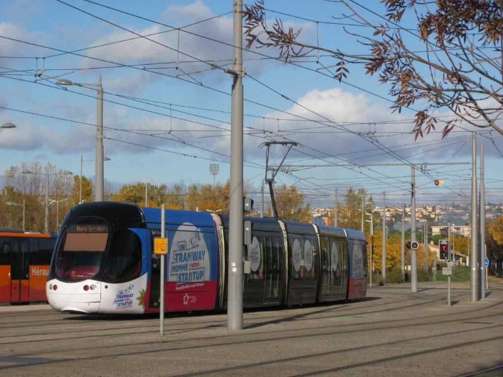 La rame 2049 Citadis 302 Alstom multiligne « Un Tramway Nommé Startup » stationne sur la voie en impasse du faisceau « Mosson » le temps que le conducteur passe d’une cabine à l’autre, le mercredi 27 novembre 2019 à 10h16. Copyright : Edouard Paris
