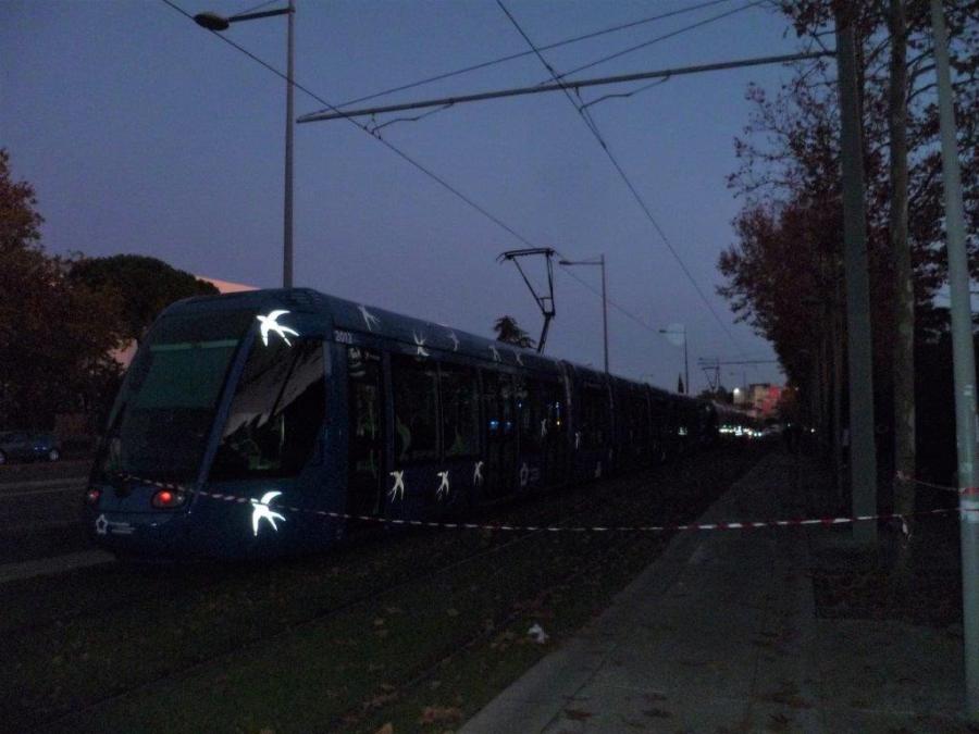 Route de Ganges à Montpellier, à moins de deux cents mètres au sud-est de la station « Hôpital Lapeyronie », la rame 2012 Citadis 402 Alstom au premier plan a été tamponné à l’arrière par la rame 2028 du même type qui la suivait, le lundi 2 décembre 2019 vers 15h30. Photo prise à 17h29 le même jour. Copyright : Edouard Paris