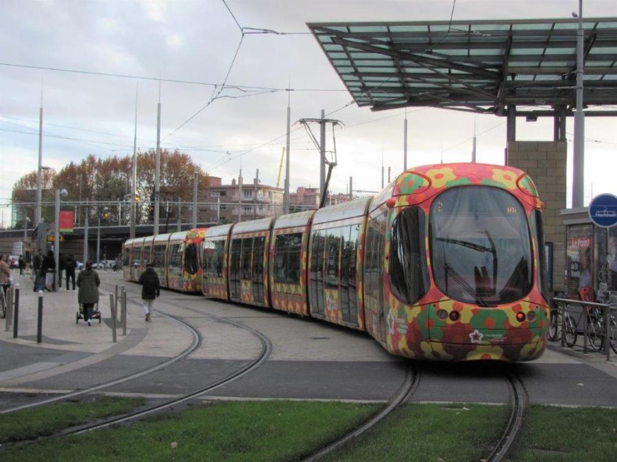 Rames 2060 et 2050 Citadis 302 Alstom, opérant sur la ligne 2, à l’arrêt depuis quelques minutes à la station « Corum », le mardi 3 décembre 2019 à 9h34. Copyright : Edouard Paris
