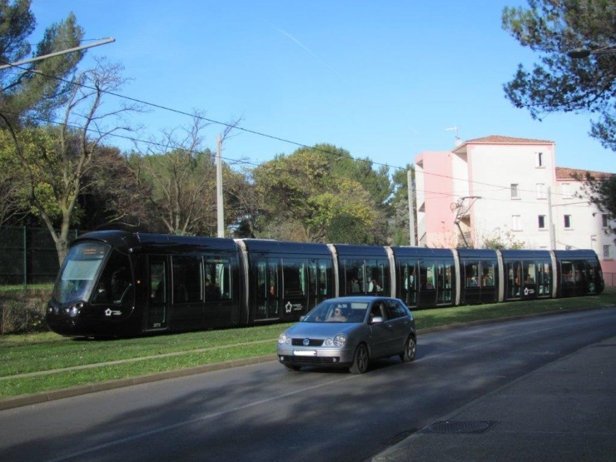 La rame 2070 Citadis 402, opérant sur la ligne 1 en direction du terminus « Mosson », est photographiée entre les stations « Saint-Paul » et « Halles de la Paillade », le samedi 7 décembre 2019. Copyright : Edouard Paris