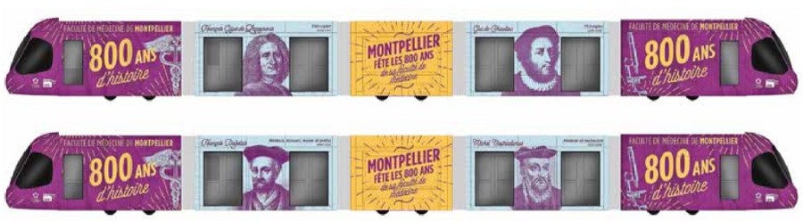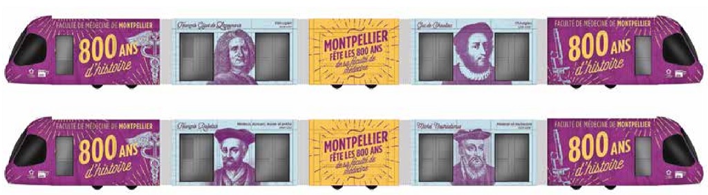 Dès le mois de janvier 2020, une rame de tramway multiligne va revêtir une livrée spéciale « 800 ans de la faculté de Médecine de Montpellier ». Capture d’écran légèrement retouchée du bas de la page 8 de Montpellier Notre Ville n° 449 – Décembre 2019 -, le journal d’information de la ville de Montpellier