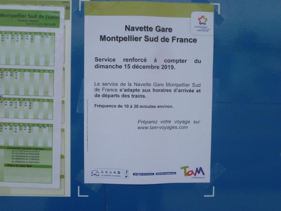 Affichette annonçant le renforcement de la desserte de l’arrêt « Gare Montpellier Sud de France » de la navette à compter du dimanche 15 décembre 2019. Photo prise le jeudi 12 décembre 2019. Copyright : Edouard Paris