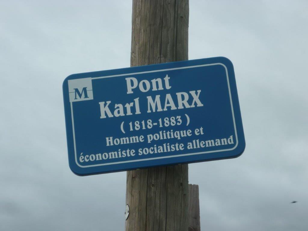 Plaque du pont Karl-Marx fixée à un poteau en bois, côté quartier Cambacérès. Elle penche à gauche. Photo prise le jeudi 12 décembre 2019. Copyright : Edouard Paris