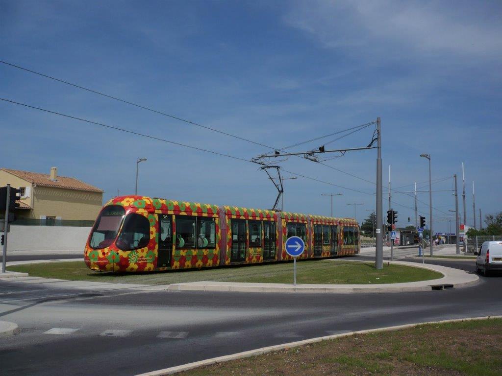 Sur la ligne 2, la rame 2051 Citadis 302 Alstom, circulant en direction du terminus « Saint Jean de Védas – Centre », est photographiée quelques secondes après avoir quitté la station « Notre-Dame de Sablassou » située sur la commune de Castelnau-le-Lez, le samedi 19 mai 2007. Copyright : Edouard Paris
