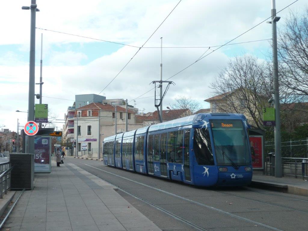 Le mardi 17 décembre 2019, la station « Voltaire » propre à la ligne 3 devrait être desservie par des rames des lignes 1 et 4 dont les itinéraires habituels devraient être une nouvelle fois modifiés en raison de la quatrième manifestation interprofessionnelle contre le projet de réforme des retraites. La rame 2005 Citadis 401 Alstom, opérant sur la ligne 1 en direction du terminus « Mosson », est photographiée dans cette station le jeudi 12 décembre 2019. Copyright : Edouard Paris