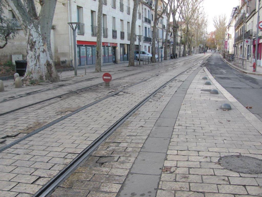 Etat plus que déplorable du revêtement de la plateforme du tramway commune aux lignes 1 et 4 à la jonction des boulevards Pasteur et Louis-Blanc à Montpellier, le dimanche 15 décembre 2019. Copyright : Edouard Paris