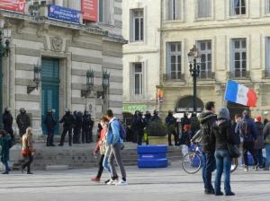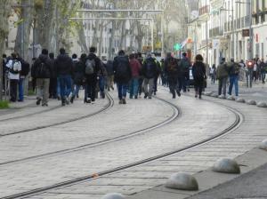 Peu après 15h20, le même jour, une soixantaine de gilets jaunes en tenue de camouflage urbain ont entamé une nouvelle marche au départ de la place de la Comédie, histoire de tuer le temps. Le petit cortège a pris la direction du boulevard Sarrail, à défaut de pouvoir aller vers le centre commercial Le Polygone. Arrivés sur le boulevard Louis-Blanc, à la hauteur de la station de tramway éponyme des lignes 1 et 4, les manifestants se sont retrouvés face à des policiers appartenant à une compagnie de sécurisation et d’intervention (CSI). Sans demander son reste, la procession est revenue sur ses pas sans que les policiers, qui les suivaient à pied à distance, n’aient eu à procéder à des tirs de grenades lacrymogènes. A 16h exactement, c’est une colonne de véhicules de gendarmes mobiles qui est arrivée sur la place Auguste-Gibert devant la gare de Montpellier Saint-Roch, carrefour stratégique des quatre lignes de tramway. Les gendarmes mobiles y sont restés à peine plus de dix minutes appelés sans doute vers un autre point chaud quelque part en centre-ville de Montpellier.