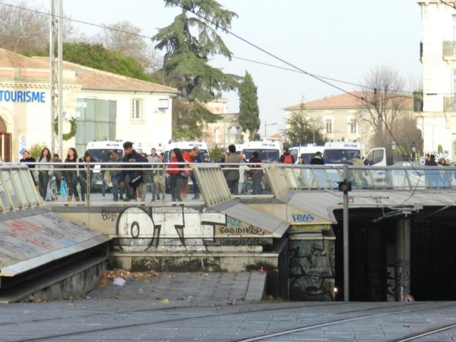A 15h19, le mardi 17 décembre 2019, des véhicules des forces de l’ordre sont garés à la jonction de la place de la Comédie et de la dalle du Triangle qui conduit au centre commercial Le Polygone à Montpellier. Copytright : Anje34