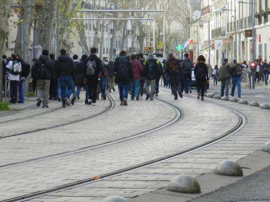 Le cortège improvisé de gilets jaunes en tenue de camouflage urbain est photographiée sur la plateforme des lignes 1 et 4 de tramway, boulevard Louis-Blanc à Montpellier, le mardi 17 décembre 2019 à 15h35. Copyright : Anje34