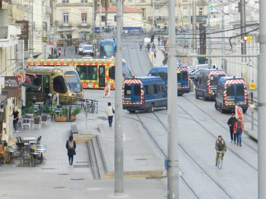 A 16h11, le mardi 17 décembre 2019, des véhicules de gendarmes mobiles quittent la place Auguste-Gibert à Montpellier, carrefour stratégique des quatre lignes de tramway. Copyright : Anje34