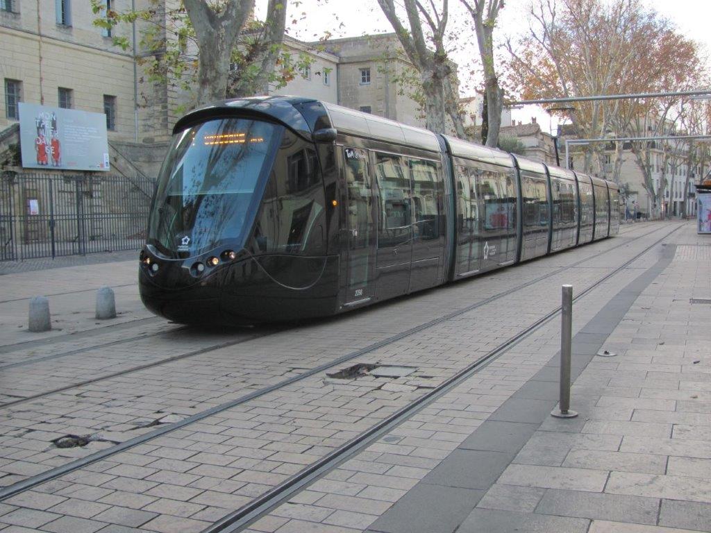 La rame 2098 Citadis 402 Alstom multiligne, opérant sur la ligne 1 en direction du terminus « Odysseum », est photographiée sur le boulevard Louis-Blanc à Montpellier, le dimanche 15 décembre 2019. Copyright : Edouard Paris