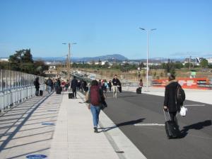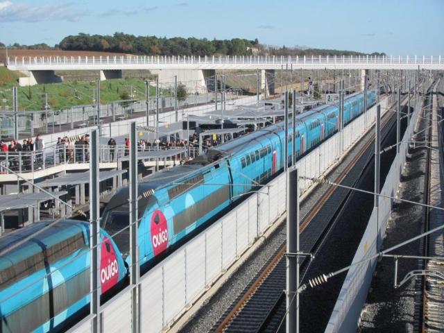 Avec la mise en service de la gare de Nîmes Pont-du-Gard, les Ouigo n’arrivent plus bondés en gare de Montpellier Sud de France dans la mesure où entre un quart et un tiers des voyageurs descendent à la première gare citée. Ainsi, à l’arrivée du Ouigo en provenance de Tourcoing composé des rames 773 et 771 TGV Duplex en gare de Montpellier Sud de France, à 12h53 précisément, il n’y avait pas de cohue. La plupart des voyageurs étaient attendus par des proches venus en voiture et seule une minorité d’entre eux s’est dirigée vers l’arrêt de la navette « Gare Montpellier Sud de France » situé au bout du parvis nord-ouest de la gare excentrée montpelliéraine. L’existence d’un parking dépose minute en face de l’arrêt de la navette venu se rajouter au parking principal situé côté parvis sud de la nouvelle gare est à l’origine de nombreux quiproquos si on s’en tient à la multitude de conversations téléphoniques à tue-tête sur le même registre : « … Tu m’as dit que tu m’attendais sur le parking mais je ne te vois pas et pourtant je suis bien sur le parking… »