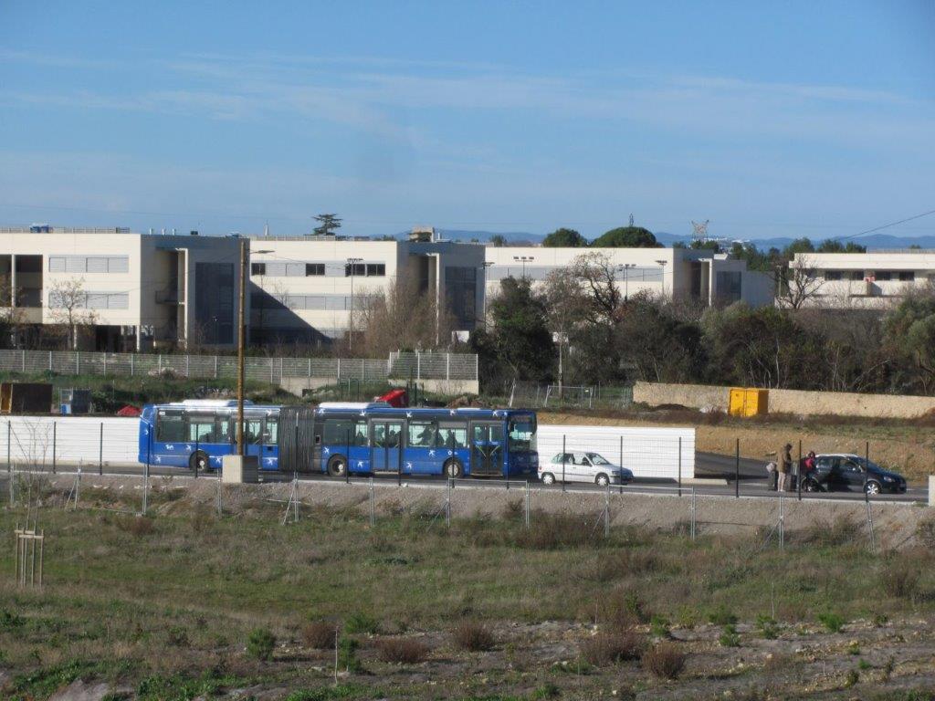 Le bus articulé 022 Citelis 18 Irisbus, venant de « Place de France », est photographié à l’approche de l’arrêt « Gare Montpellier Sud de France », le samedi 21 décembre 2019. Copyright : Edouard Paris