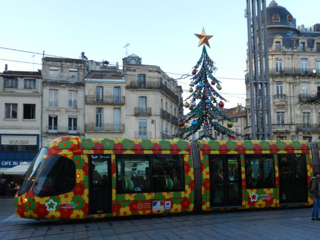 Le sapin magique surmonté d’une étoile à cinq branches installé sur la place de la Comédie à Montpellier tout à côté de la station « Comédie » des lignes 1 et 2 de tramway. Photo prise le vendredi 20 décembre 2019. Copyright : Anje34