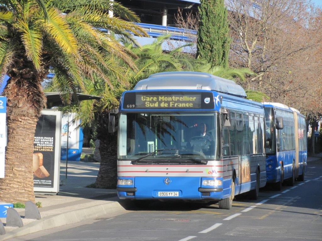 Ce mardi 24 décembre 2019 après-midi, la navette « Gare Montpellier Sud de France » était assurée par le bus 609 Agora S GNV Renault et par le bus articulé 023 Citelis 18 Irisbus. Photo prise à place de France, le mardi 24 décembre 2019 à 14h54. Copyright : Edouard Paris