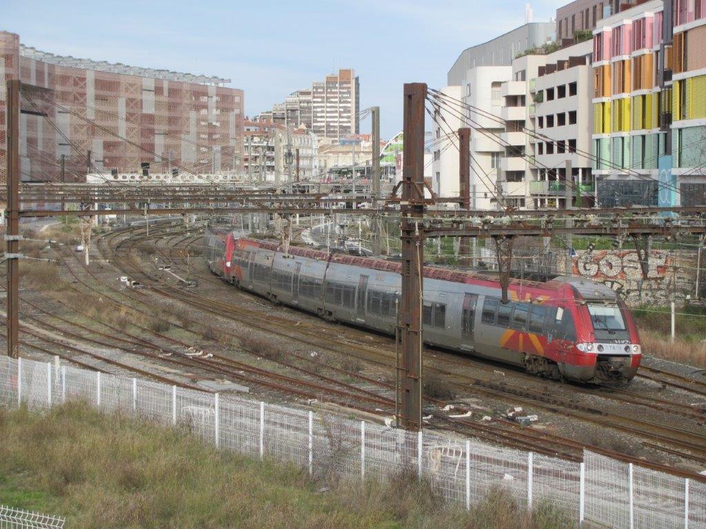 Une composition de trois rames Z 27500 Bombardier, rame 27609/610 en tête, assurant une relation TER Nîmes – Narbonne, vient de quitter la gare de Montpellier Saint-Roch avec peu de passagers à son bord. Photo prise à 14h56 le jeudi 26 décembre 2019, 22e jour de grève consécutif à la SNCF contre le projet de réforme des retraites. Copyright : Edouard Paris