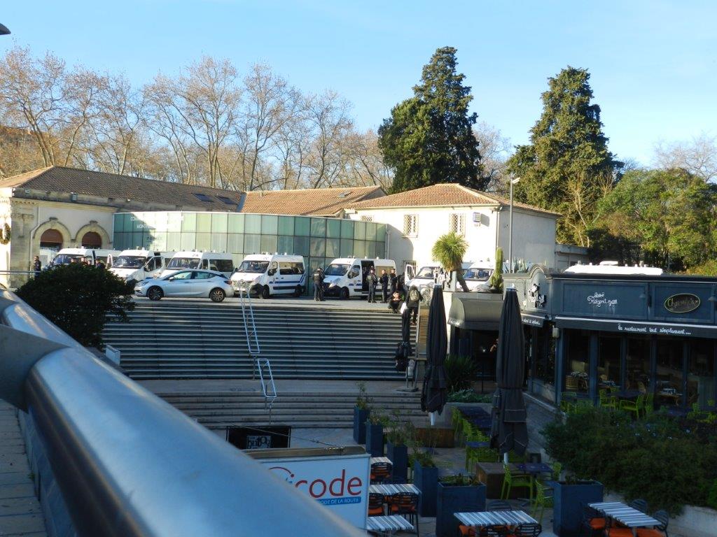 A Montpellier, à 15h33, le samedi 28 décembre 2019, acte LIX des gilets jaunes, des véhicules des forces de l’ordre sont photographiés devant le commissariat de police de la place de la Comédie. Copyright : Anje34