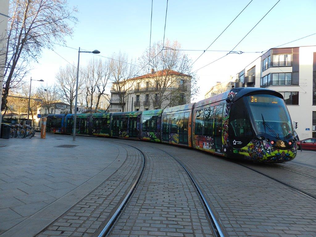 Manifestation des gilets jaunes en centre-ville de Montpellier oblige, la rame 2085 Citadis 402 Alstom, opérant sur la ligne 3 et circulant en direction du terminus « Mosson », est exceptionnellement photographiée place Albert-1er à l’approche de la station « Place Albert 1er – Saint-Charles » de la ligne 1, le samedi 28 décembre 2019 à 16h22. Copyright : Anje34