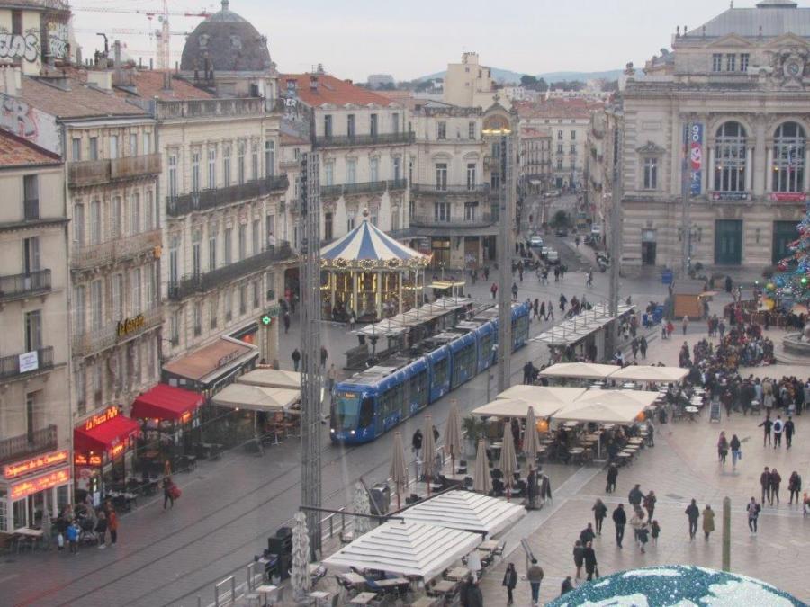 La rame 2005 Citadis 401 Alstom, opérant sur la ligne 1 en direction du terminus « Mosson », quitte la station « Comédie » commune aux lignes 1 et 2 de tramway, le vendredi 3 janvier 2020. Copyright : Edouard Paris