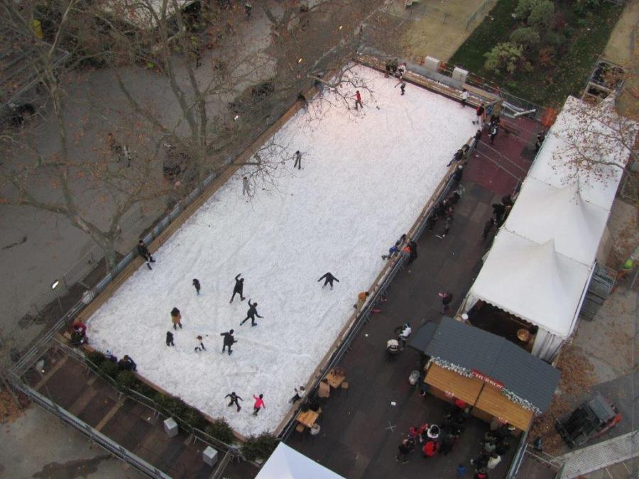 Photographie de la patinoire en plein air installée sur l’esplanade Charles-de-Gaulle à Montpellier depuis une des 24 cabines de la grande roue de la place de la Comédie, le vendredi 3 janvier 2020. Copyright : Edouard Paris