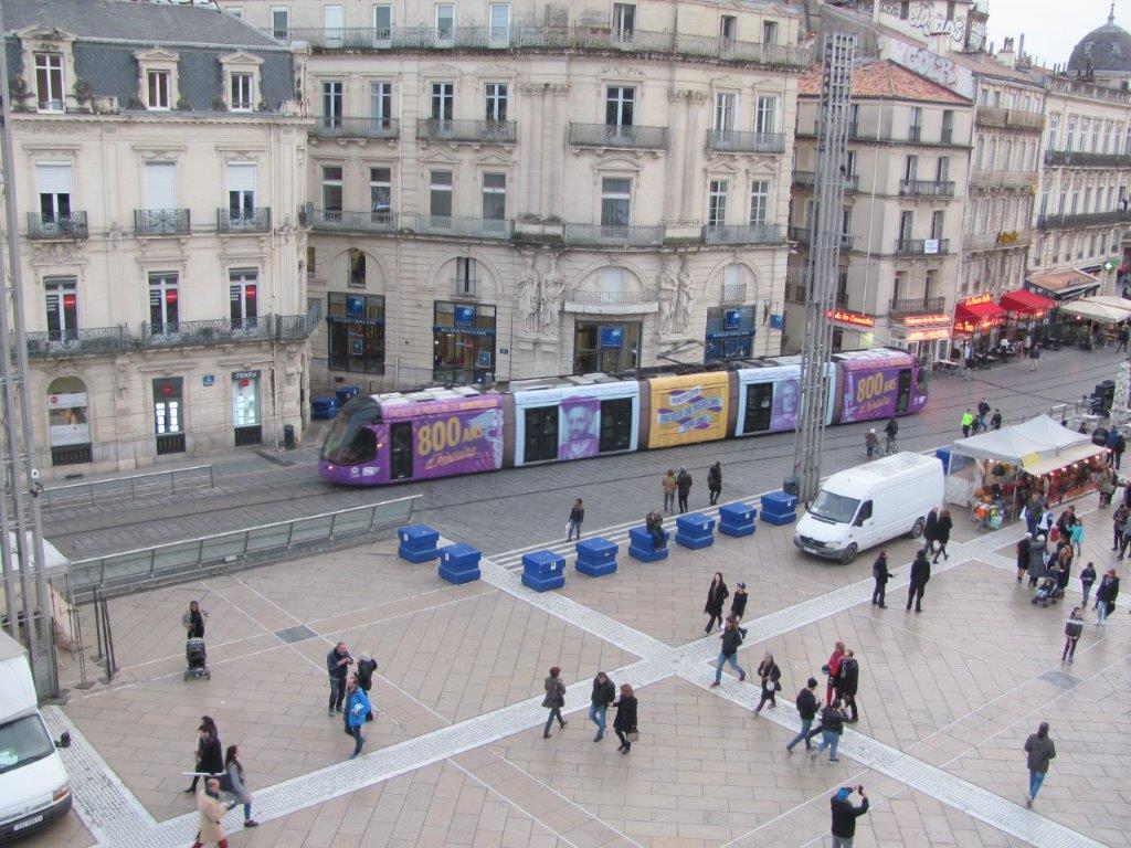 Photographie de la rame 2048 Citadis 302 Alstom multiligne « Montpellier faculté de Médecine 800 ans », opérant sur la ligne 2 de tramway, depuis une des 24 cabines de la grande roue de la place de la Comédie à Montpellier, le vendredi 3 janvier 2020. Copyright : Edouard Paris