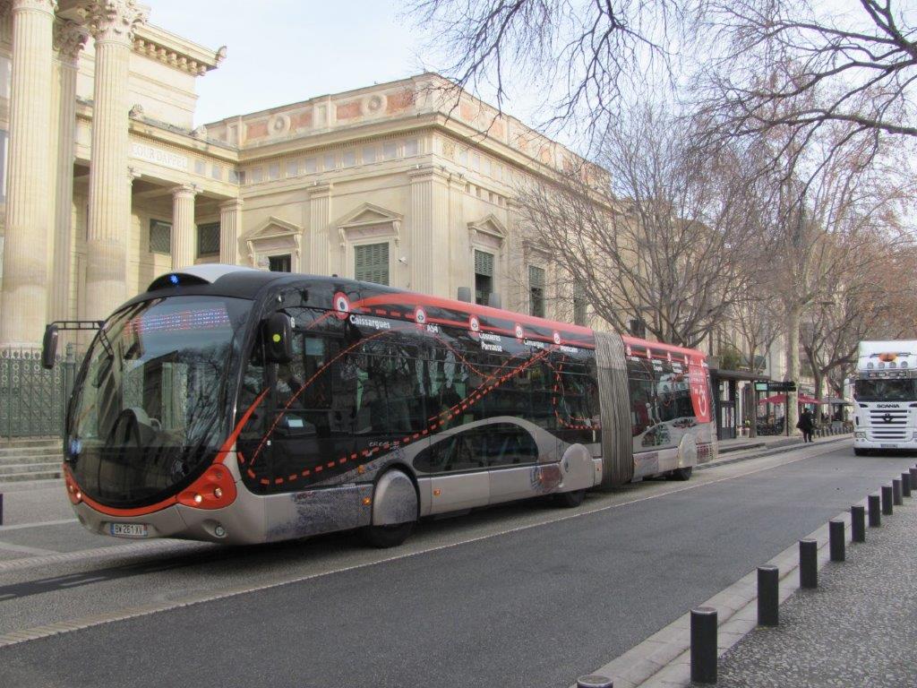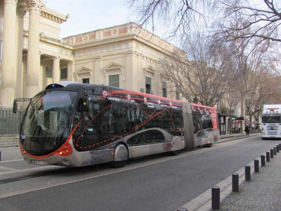 A Nîmes, le BHNS 706 Crealis Neo 18 Irisbus, opérant sur la ligne Tram’bus T1 Tango+ en direction du terminus « Caissargues », est photographié quelques secondes après avoir quitté la station « Esplanade T1 », le mardi 7 janvier 2020. Copyright : Edouard Paris