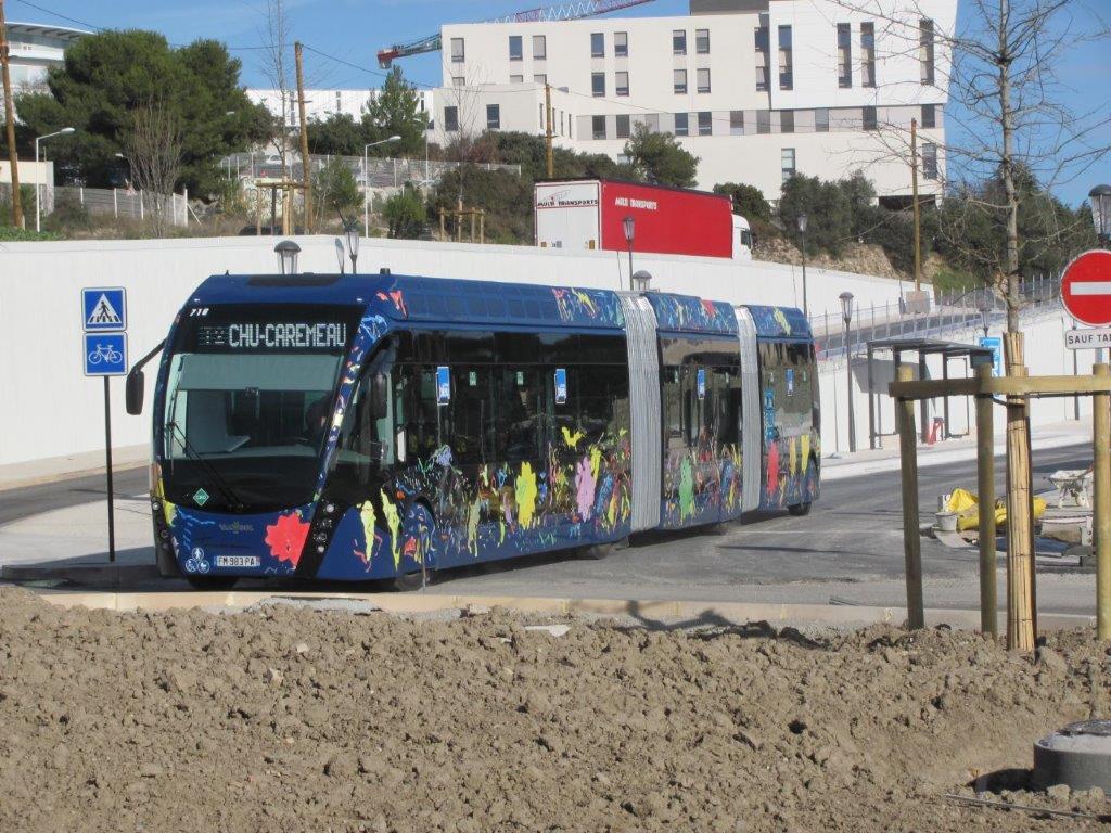 A Nîmes, le BHNS 716 bi-articulé Exqui.City Van Hool, opérant sur la ligne Tram’bus T2 Diagonal en direction du terminus « CHU Carémeau », est photographié quelques secondes après avoir quitté la station « Laennec », le mardi 7 janvier 2020. Copyright : Edouard Paris