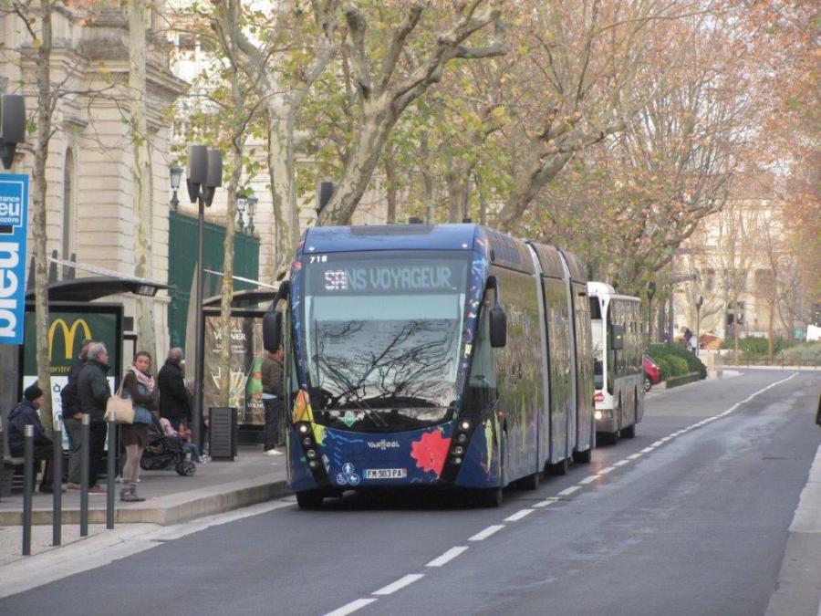 A Nîmes, le BHNS 716 bi-articulé Exqui.City Van Hool est photographié au terminus de la ligne Tram’bus T2 Diagonal « Gare Feuchères », le mardi 7 janvier 2020. Copyright : Edouard Paris