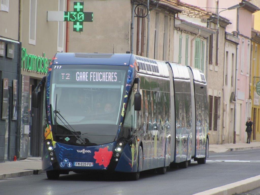 A Nîmes, rue du Cirque-Romain, le BHNS 717 bi-articulé Exqui.City Van Hool, opérant sur la ligne Tram’bus T2 Diagonal, est photographié entre les stations « Jaurès » et « Musée Romanité », le mardi 7 janvier 2020. Copyright : Edouard Paris