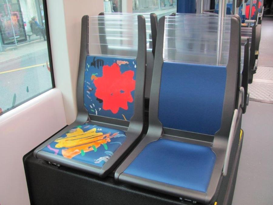A Nîmes, photographie de deux sièges équipant un BHNS bi-articulé Exqui.City Van Hool, opérant sur la ligne Tram’bus T2 Diagonal, dont un est revêtu de motifs dessinés par l’artiste nîmois Michel Tombereau. Photo prise le mardi 7 janvier 2020. Copyright : Edouard Paris