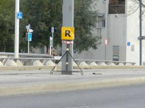 - Sur le pont Jean-Zuccarelli à Montpellier, la lettre R sur fond jaune signifie la fin de limitation de vitesse à 5 km/h imposée sur voie 1 aux rames des lignes 1 et 3 quittant la station « Moularès (Hôtel de Ville) en direction du sud-est ou du sud. Photo prise le mardi 7 janvier 2020. Copyright : Anje34